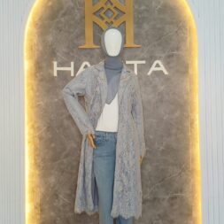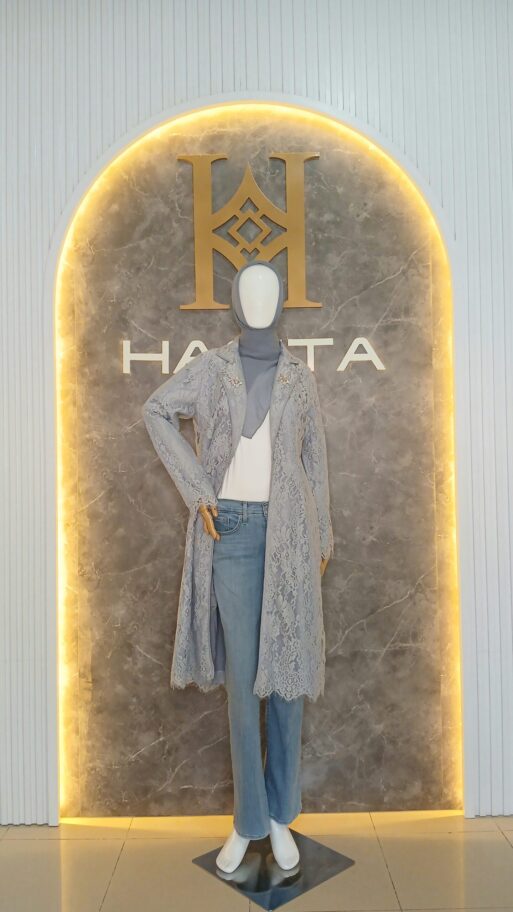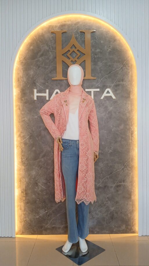 Adalah Blazer mewah berbahan brukat yang terlihat lembut dan cocok untuk tampilan feminim formal.